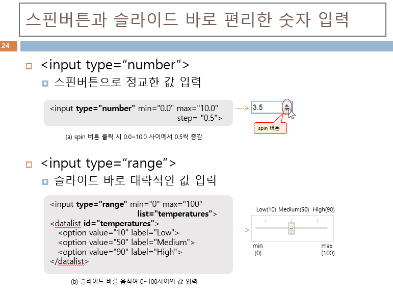 </html>| [HTML5] 스핀버튼 / 슬라이드 바 (0) | 2024.03.25 |