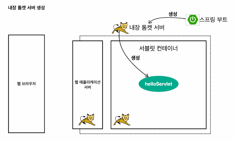 - 서블릿 컨테이너는 요청을 처리할 서블릿(helloServlet)을 실행한다.