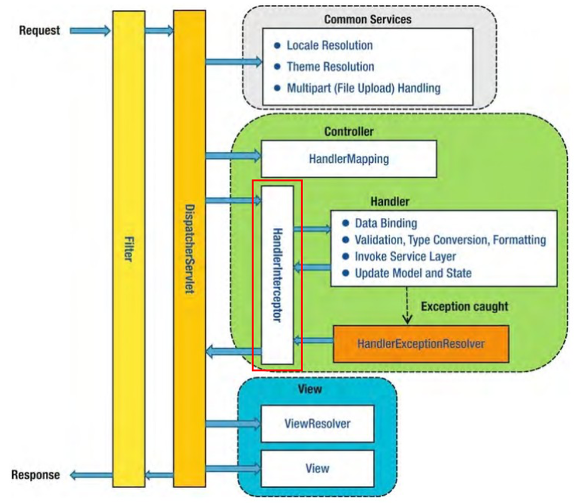 일반적으로 핸들러(주로 @Controller로 표시됨)가 실행되기 전에 인터셉터가 먼저 실행되고 인터셉터를 통해 요청에 대해 원하는 작업이나 로직을 수행한 후 컨트롤러로 요청 객체를 전달한다.